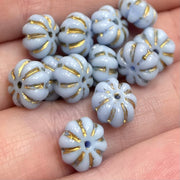 Measure 8 x 5mm.Vintage light opal blue German flower glass beads. Have an aged 24 karat gold leaf detailing in the grooves of the flowers. Amazing in jewelry designs!