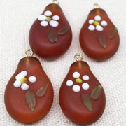2 vintage handmade frosted amber drop glass pendants with floral motifs.