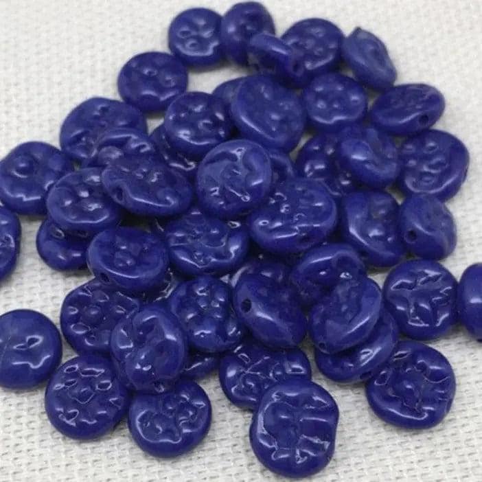 Lovely vintage mixed handmade opaque blue pressed coin glass beads. Pattern on both sides. Slightly darker in person.You will receive 48 beads measuring 6mm to 7mm.Thank you for visiting my shop!