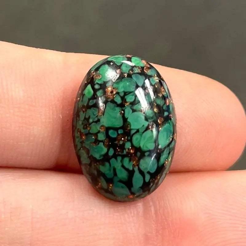 Green and black flatback vintage glass stone with copper flecksthru out the cabochon. 17x13mm