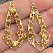 Gold Plated Filigree jewelry stamping, 1 1/4 " tall. Jewelry stamping can be used to make earrings or pendants. Apply a glass crystal cabochon near base of finding to create a fabulous jewelry piece.