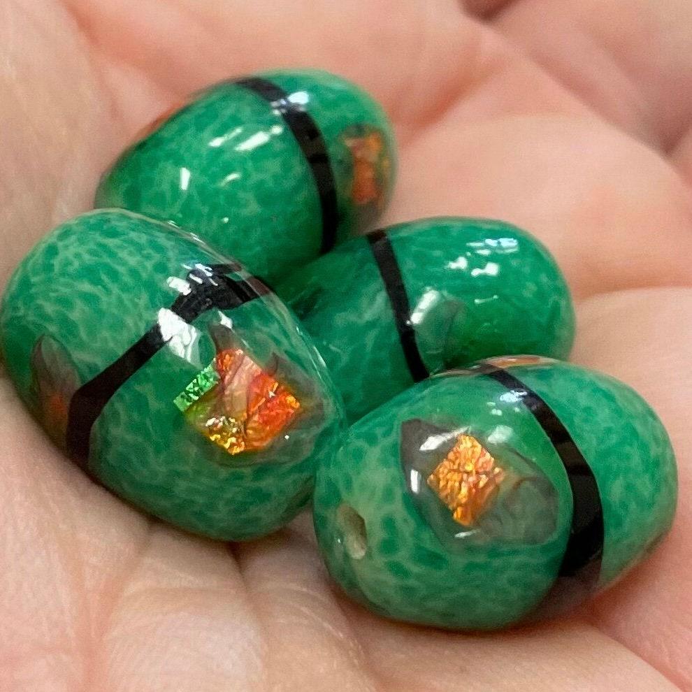 4 Vintage Green Japan Foil Oval Glass Beads #9602